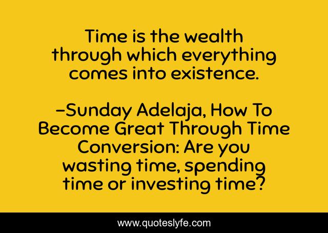This page presents the quote "Time is the wealth through which everything comes into existence.". Author of this quote is Sunday Adelaja, How To Become Great Through Time Conversion: Are you wasting time, spending time or investing time?. This quote is about products-of-time, conversion, existence, productivity, wealth, gift, great, work, life,.