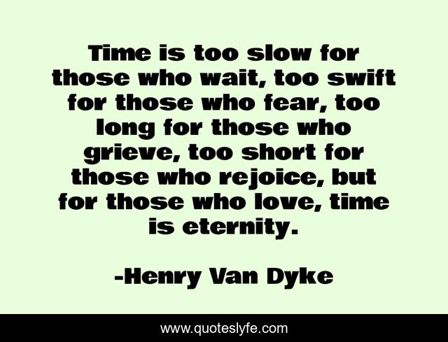 This page presents the quote "Time is too slow for those who wait, too swift for those who fear, too long for those who grieve, too short for those who rejoice, but for those who love, time is eternity.". Author of this quote is Henry Van Dyke. This quote is about love, affection, time,.