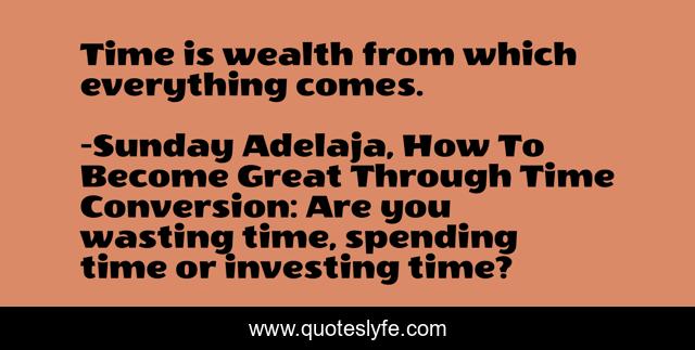 This page presents the quote "Time is wealth from which everything comes.". Author of this quote is Sunday Adelaja, How To Become Great Through Time Conversion: Are you wasting time, spending time or investing time?. This quote is about great, productivity, wealth, gift, wealth-creation, work, life, convert, value,.
