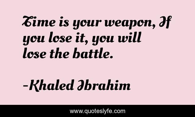 This page presents the quote "Time is your weapon, If you lose it, you will lose the battle.". Author of this quote is Khaled Ibrahim. This quote is about life, lose, positive, weapon, motivational, confidence, quotes-about-life, quotes, time,.