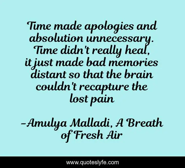 This page presents the quote "Time made apologies and absolution unnecessary. Time didn't really heal, it just made bad memories distant so that the brain couldn't recapture the lost pain". Author of this quote is Amulya Malladi, A Breath of Fresh Air. This quote is about apologies, memories, absolution, recapture, time,.
