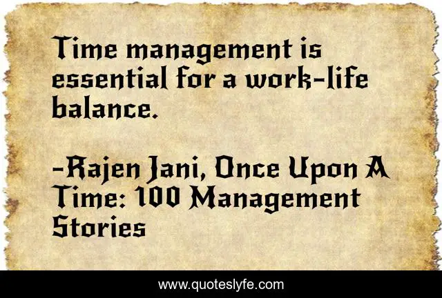 This page presents the quote "Time management is essential for a work-life balance.". Author of this quote is Rajen Jani, Once Upon A Time: 100 Management Stories. This quote is about motivation, communication, sales, anger, improvement, quality, management, knowledge, strategy,.