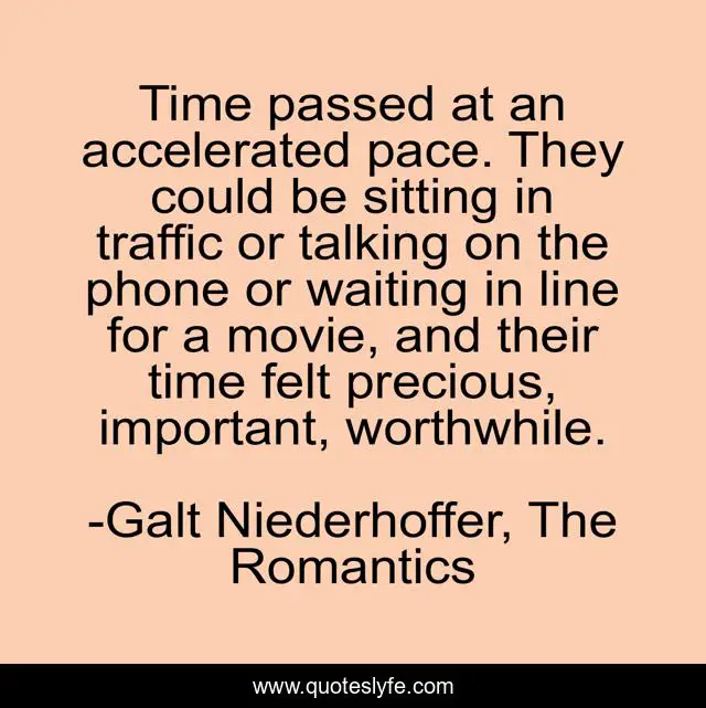 This page presents the quote "Time passed at an accelerated pace. They could be sitting in traffic or talking on the phone or waiting in line for a movie, and their time felt precious, important, worthwhile.". Author of this quote is Galt Niederhoffer, The Romantics. This quote is about worthwhile, phone, movie, accelerated, pace, talking, waiting, important, traffic,.