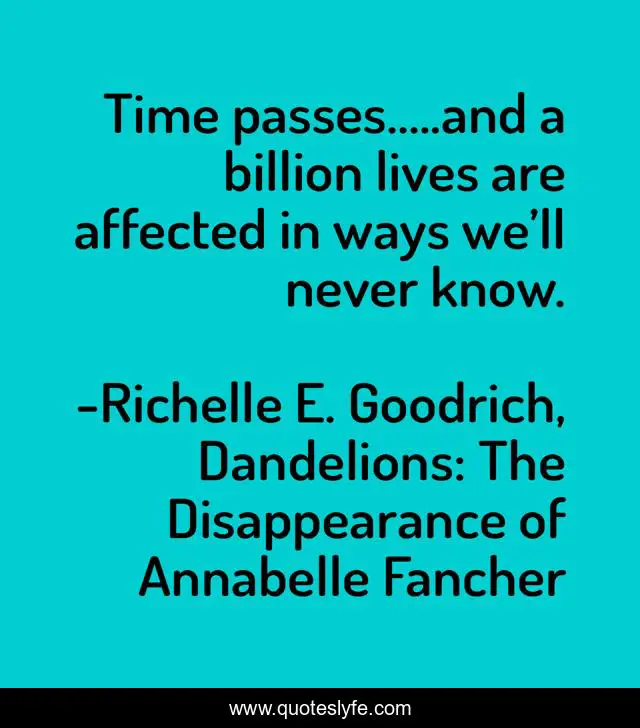 "Richelle E. Goodrich, Dandelions: The Disappearance of Annabelle Fancher Quotes." Quoteslyfe.com, 2025. Fri. 05 Dec. 2025. <https://www.quoteslyfe.com/quote/Time-passes-and-a-billion-lives-are-40252>.