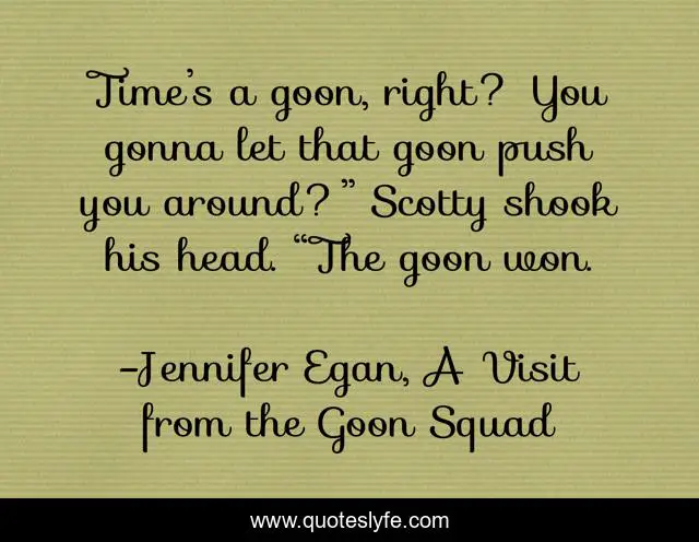 This page presents the quote "Time’s a goon, right? You gonna let that goon push you around?” Scotty shook his head. “The goon won.". Author of this quote is Jennifer Egan, A Visit from the Goon Squad. .
