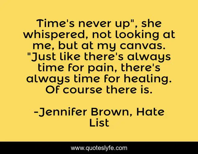 This page presents the quote "Time's never up", she whispered, not looking at me, but at my canvas. "Just like there's always time for pain, there's always time for healing. Of course there is.". Author of this quote is Jennifer Brown, Hate List. This quote is about pain, healing, time,.