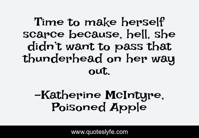 This page presents the quote "Time to make herself scarce because, hell, she didn’t want to pass that thunderhead on her way out.". Author of this quote is Katherine McIntyre, Poisoned Apple. This quote is about emotional, avoiding-the-issue, storm, thunderhead,.