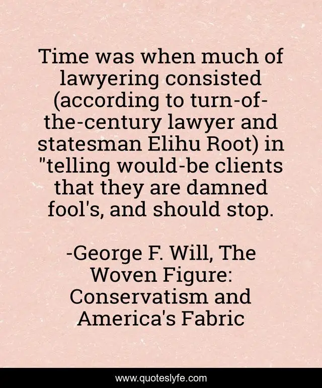 This page presents the quote "Time was when much of lawyering consisted (according to turn-of-the-century lawyer and statesman Elihu Root) in "telling would-be clients that they are damned fool's, and should stop.". Author of this quote is George F. Will, The Woven Figure: Conservatism and America's Fabric. This quote is about reconciliation, graciousness, leadership, unity,.