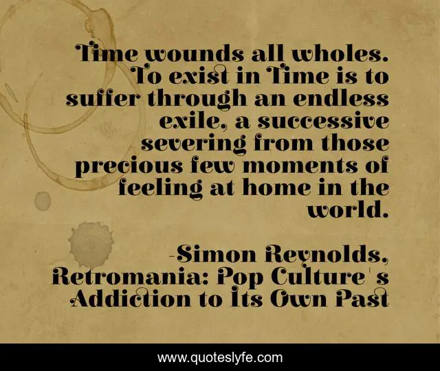 This page presents the quote "Time wounds all wholes. To exist in Time is to suffer through an endless exile, a successive severing from those precious few moments of feeling at home in the world.". Author of this quote is Simon Reynolds, Retromania: Pop Culture's Addiction to Its Own Past. This quote is about transience, nostalgia,.