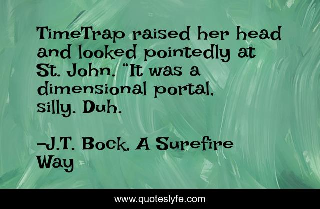 This page presents the quote "TimeTrap raised her head and looked pointedly at St. John. “It was a dimensional portal, silly. Duh.". Author of this quote is J.T. Bock, A Surefire Way. This quote is about humor, paranormal-romance, superheroes,.