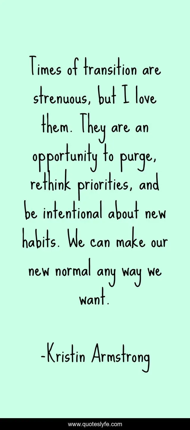 This page presents the quote "Times of transition are strenuous, but I love them. They are an opportunity to purge, rethink priorities, and be intentional about new habits. We can make our new normal any way we want.". Author of this quote is Kristin Armstrong. This quote is about transition, opportunity,.