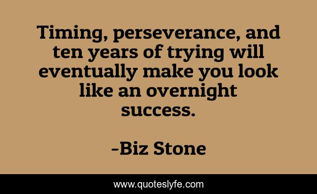 This page presents the quote "Timing, perseverance, and ten years of trying will eventually make you look like an overnight success.". Author of this quote is Biz Stone. This quote is about life, startups, success,.