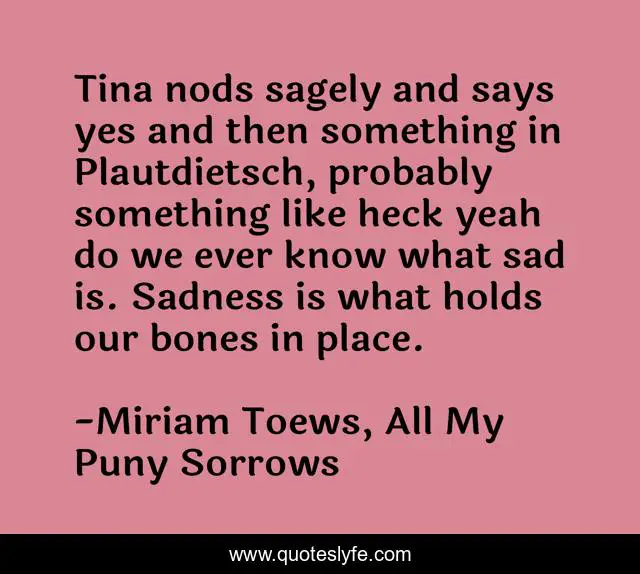 This page presents the quote "Tina nods sagely and says yes and then something in Plautdietsch, probably something like heck yeah do we ever know what sad is. Sadness is what holds our bones in place.". Author of this quote is Miriam Toews, All My Puny Sorrows. This quote is about sadness, survival,.