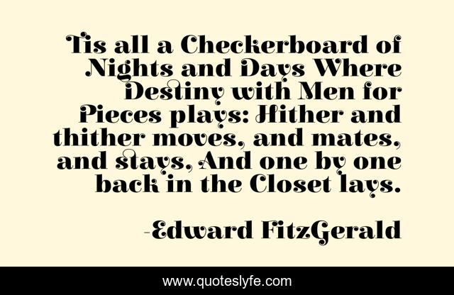 This page presents the quote "Tis all a Checkerboard of Nights and Days Where Destiny with Men for Pieces plays: Hither and thither moves, and mates, and stays, And one by one back in the Closet lays.". Author of this quote is Edward FitzGerald. This quote is about life, games, war,.