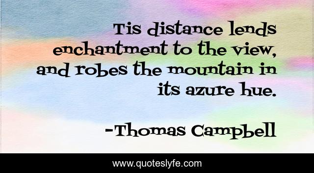 This page presents the quote "Tis distance lends enchantment to the view, and robes the mountain in its azure hue.". Author of this quote is Thomas Campbell. This quote is about mountain, view, distance,.