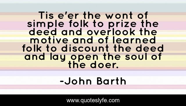 This page presents the quote "Tis e'er the wont of simple folk to prize the deed and overlook the motive and of learned folk to discount the deed and lay open the soul of the doer.". Author of this quote is John Barth. This quote is about character, personality,.