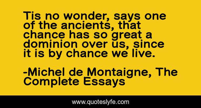 This page presents the quote "Tis no wonder, says one of the ancients, that chance has so great a dominion over us, since it is by chance we live.". Author of this quote is Michel de Montaigne, The Complete Essays. This quote is about chance, circumstance, life, dominion,.