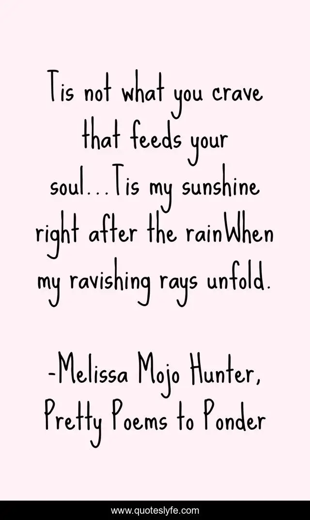 This page presents the quote "Tis not what you crave that feeds your soul...Tis my sunshine right after the rainWhen my ravishing rays unfold.". Author of this quote is Melissa Mojo Hunter, Pretty Poems to Ponder. This quote is about rays, sunshine, soul, rain, craving, quotes, quotes-about-life, quotes-to-live-by, rays-of-light,.