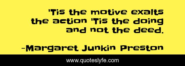 This page presents the quote "'Tis the motive exalts the action 'Tis the doing and not the deed.". Author of this quote is Margaret Junkin Preston. .