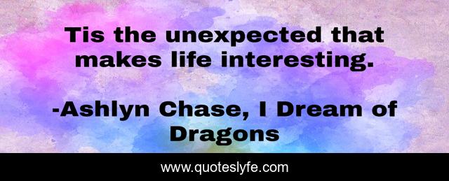 This page presents the quote "Tis the unexpected that makes life interesting.". Author of this quote is Ashlyn Chase, I Dream of Dragons. This quote is about leprechauns, vamps, urban-fantasy-romance, little-people, shifters, witches, dragons-romance, goddesses,.