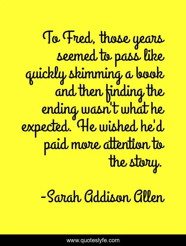 This page presents the quote "To Fred, those years seemed to pass like quickly skimming a book and then finding the ending wasn't what he expected. He wished he'd paid more attention to the story.". Author of this quote is Sarah Addison Allen. This quote is about comedy, magic-realism, thriller,.