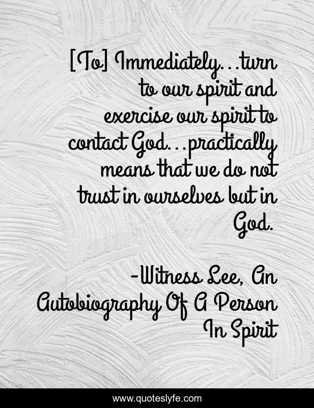 This page presents the quote "[To] Immediately...turn to our spirit and exercise our spirit to contact God...practically means that we do not trust in ourselves but in God.". Author of this quote is Witness Lee, An Autobiography Of A Person In Spirit. This quote is about human-spirit, witness-lee, christian-living, christian-life, mingled-spirit, trusting-god,.