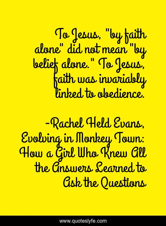 This page presents the quote "To Jesus, "by faith alone" did not mean "by belief alone." To Jesus, faith was invariably linked to obedience.". Author of this quote is Rachel Held Evans, Evolving in Monkey Town: How a Girl Who Knew All the Answers Learned to Ask the Questions. This quote is about faith, works, salvation,.