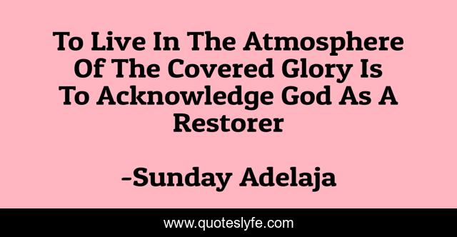 This page presents the quote "To Live In The Atmosphere Of The Covered Glory Is To Acknowledge God As A Restorer". Author of this quote is Sunday Adelaja. This quote is about atmosphere, glory, restorer, god, cover, live,.