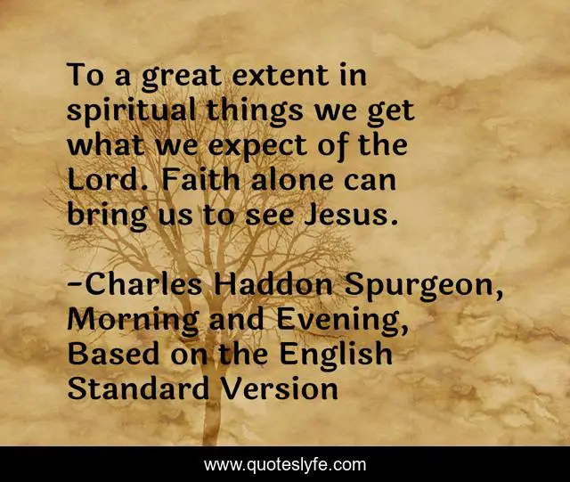 This page presents the quote "To a great extent in spiritual things we get what we expect of the Lord. Faith alone can bring us to see Jesus.". Author of this quote is Charles Haddon Spurgeon, Morning and Evening, Based on the English Standard Version. This quote is about discipleship, pessimism, optimism,.
