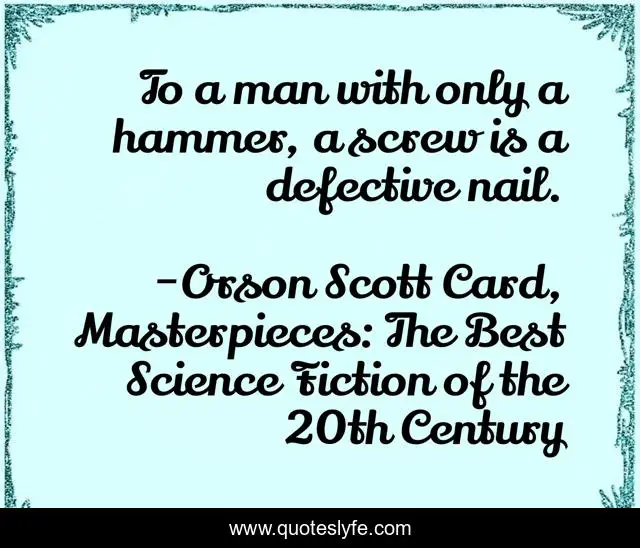 This page presents the quote "To a man with only a hammer, a screw is a defective nail.". Author of this quote is Orson Scott Card, Masterpieces: The Best Science Fiction of the 20th Century. This quote is about hammer, sci-fi, different-perspective,.
