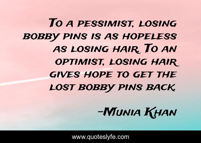 This page presents the quote "To a pessimist, losing bobby pins is as hopeless as losing hair. To an optimist, losing hair gives hope to get the lost bobby pins back.". Author of this quote is Munia Khan. This quote is about pessimistic, pessimism, hopeful, back, optimism, hair, hopelessness, hopeless, optimist,.