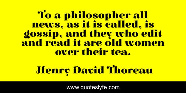 This page presents the quote "To a philosopher all news, as it is called, is gossip, and they who edit and read it are old women over their tea.". Author of this quote is Henry David Thoreau. This quote is about tea, gossip, news,.