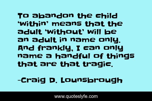 This page presents the quote "To abandon the child ‘within’ means that the adult ‘without’ will be an adult in name only. And frankly, I can only name a handful of things that are that tragic.". Author of this quote is Craig D. Lounsbrough. This quote is about development, loss, stunted, adulthood, inner-child, personal-growth, losses, abandonment, maturation,.