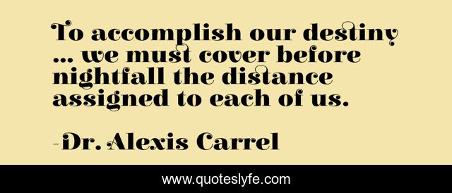 This page presents the quote "To accomplish our destiny ... we must cover before nightfall the distance assigned to each of us.". Author of this quote is Dr. Alexis Carrel. This quote is about day, one,.