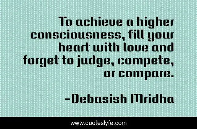 This page presents the quote "To achieve a higher consciousness, fill your heart with love and forget to judge, compete, or compare.". Author of this quote is Debasish Mridha. This quote is about consciousness, fill-your-heart, philosophy, debasish-mridha, quotes, inspirational, enthusiasm, forget-to-judge, debasish-mridha-m-d,.