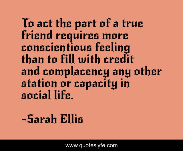 This page presents the quote "To act the part of a true friend requires more conscientious feeling than to fill with credit and complacency any other station or capacity in social life.". Author of this quote is Sarah Ellis. .