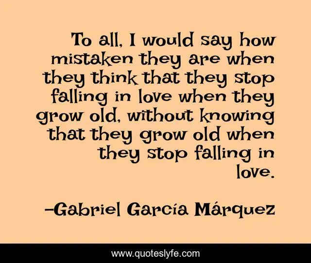 This page presents the quote "To all, I would say how mistaken they are when they think that they stop falling in love when they grow old, without knowing that they grow old when they stop falling in love.". Author of this quote is Gabriel García Márquez. This quote is about ageing, love, affection, aging,.