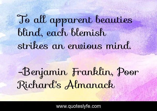 This page presents the quote "To all apparent beauties blind, each blemish strikes an envious mind.". Author of this quote is Benjamin Franklin, Poor Richard's Almanack. .