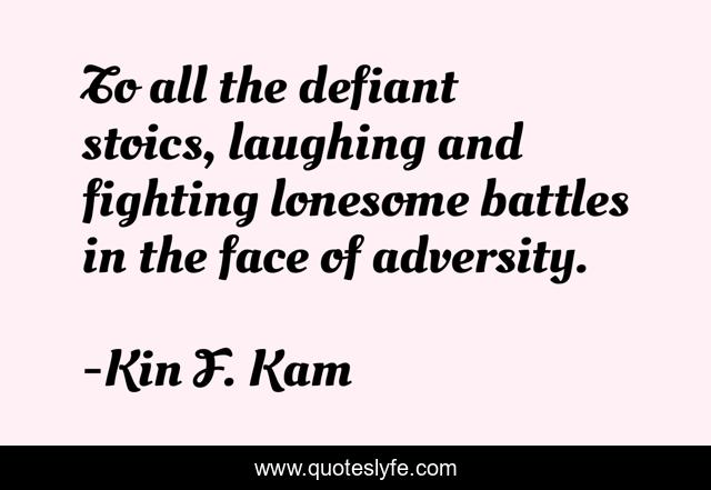 This page presents the quote "To all the defiant stoics, laughing and fighting lonesome battles in the face of adversity.". Author of this quote is Kin F. Kam. This quote is about inspirational-attitude, health,.