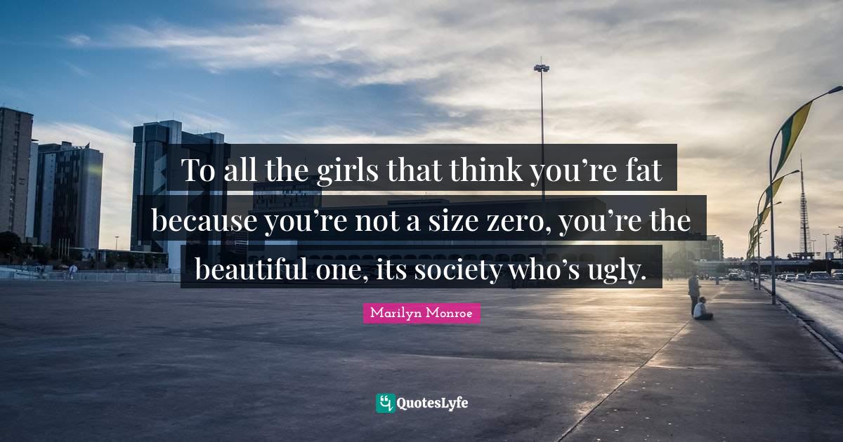 This page presents the quote "To all the girls that think you’re fat because you’re not a size zero, you’re the beautiful one, its society who’s ugly.". Author of this quote is Marilyn Monroe. This quote is about size zero, beautiful, inspirational, society, ugly, beauty,.