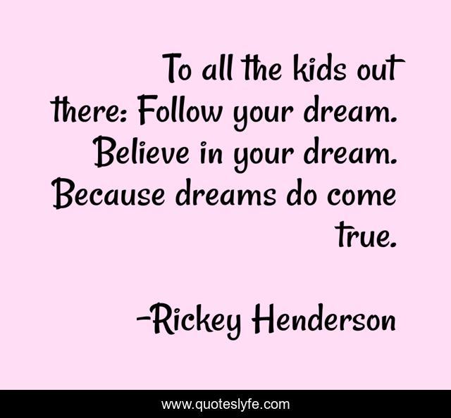 This page presents the quote "To all the kids out there: Follow your dream. Believe in your dream. Because dreams do come true.". Author of this quote is Rickey Henderson. This quote is about believe, dream, kids,.