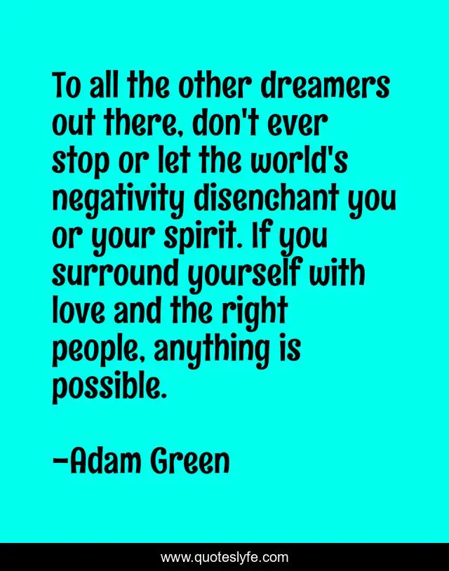 This page presents the quote "To all the other dreamers out there, don't ever stop or let the world's negativity disenchant you or your spirit. If you surround yourself with love and the right people, anything is possible.". Author of this quote is Adam Green. This quote is about world, yourself,.