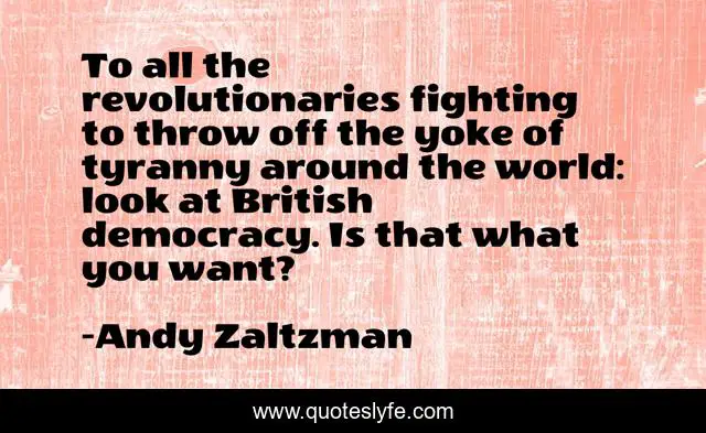 This page presents the quote "To all the revolutionaries fighting to throw off the yoke of tyranny around the world: look at British democracy. Is that what you want?". Author of this quote is Andy Zaltzman. This quote is about tyranny, revolution, arab-spring, democracy, britain, news-international-phone-hacking, 2011,.
