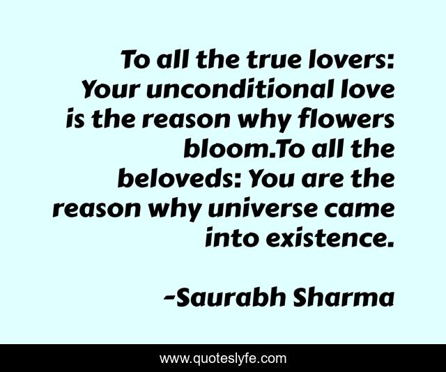 This page presents the quote "To all the true lovers: Your unconditional love is the reason why flowers bloom.To all the beloveds: You are the reason why universe came into existence.". Author of this quote is Saurabh Sharma. This quote is about motivation, love, universe, beloved, lover, existence, affection,.
