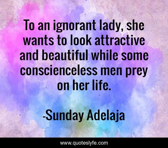This page presents the quote "To an ignorant lady, she wants to look attractive and beautiful while some conscienceless men prey on her life.". Author of this quote is Sunday Adelaja. This quote is about life, prey, ignorance,.