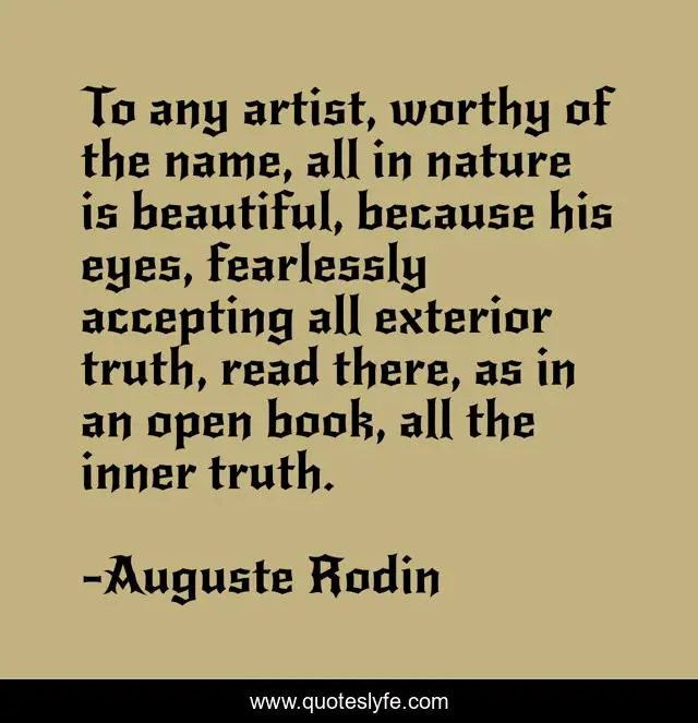 This page presents the quote "To any artist, worthy of the name, all in nature is beautiful, because his eyes, fearlessly accepting all exterior truth, read there, as in an open book, all the inner truth.". Author of this quote is Auguste Rodin. This quote is about beautiful, eyes, truth,.