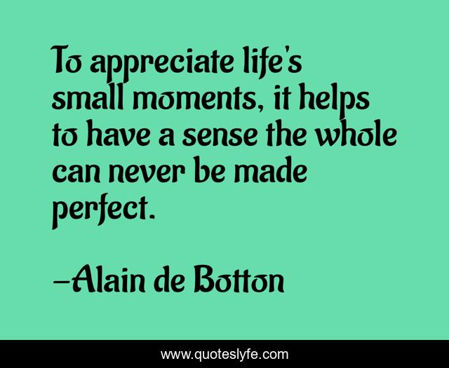 This page presents the quote "To appreciate life's small moments, it helps to have a sense the whole can never be made perfect.". Author of this quote is Alain de Botton. This quote is about appreciation, life, acceptance, perfection,.