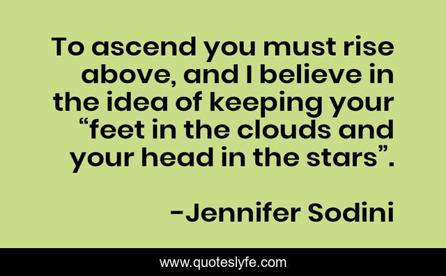 This page presents the quote "To ascend you must rise above, and I believe in the idea of keeping your “feet in the clouds and your head in the stars”.". Author of this quote is Jennifer Sodini. This quote is about spiritual, consciousness, positive, motivational, confidence, ascended-masters, spirituality, the-universe, optimistic,.