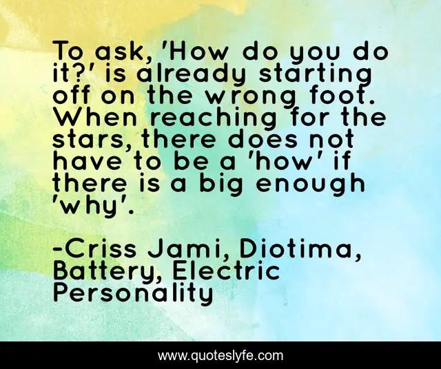 This page presents the quote "To ask, 'How do you do it?' is already starting off on the wrong foot. When reaching for the stars, there does not have to be a 'how' if there is a big enough 'why'.". Author of this quote is Criss Jami, Diotima, Battery, Electric Personality. This quote is about goal, purpose, meaning, wrong-foot, reach-for-your-dreams, reason, determination, reach-for-the-stars, ambition,.