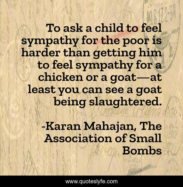 This page presents the quote "To ask a child to feel sympathy for the poor is harder than getting him to feel sympathy for a chicken or a goat—at least you can see a goat being slaughtered.". Author of this quote is Karan Mahajan, The Association of Small Bombs. This quote is about poor, children, feel-sympathy,.